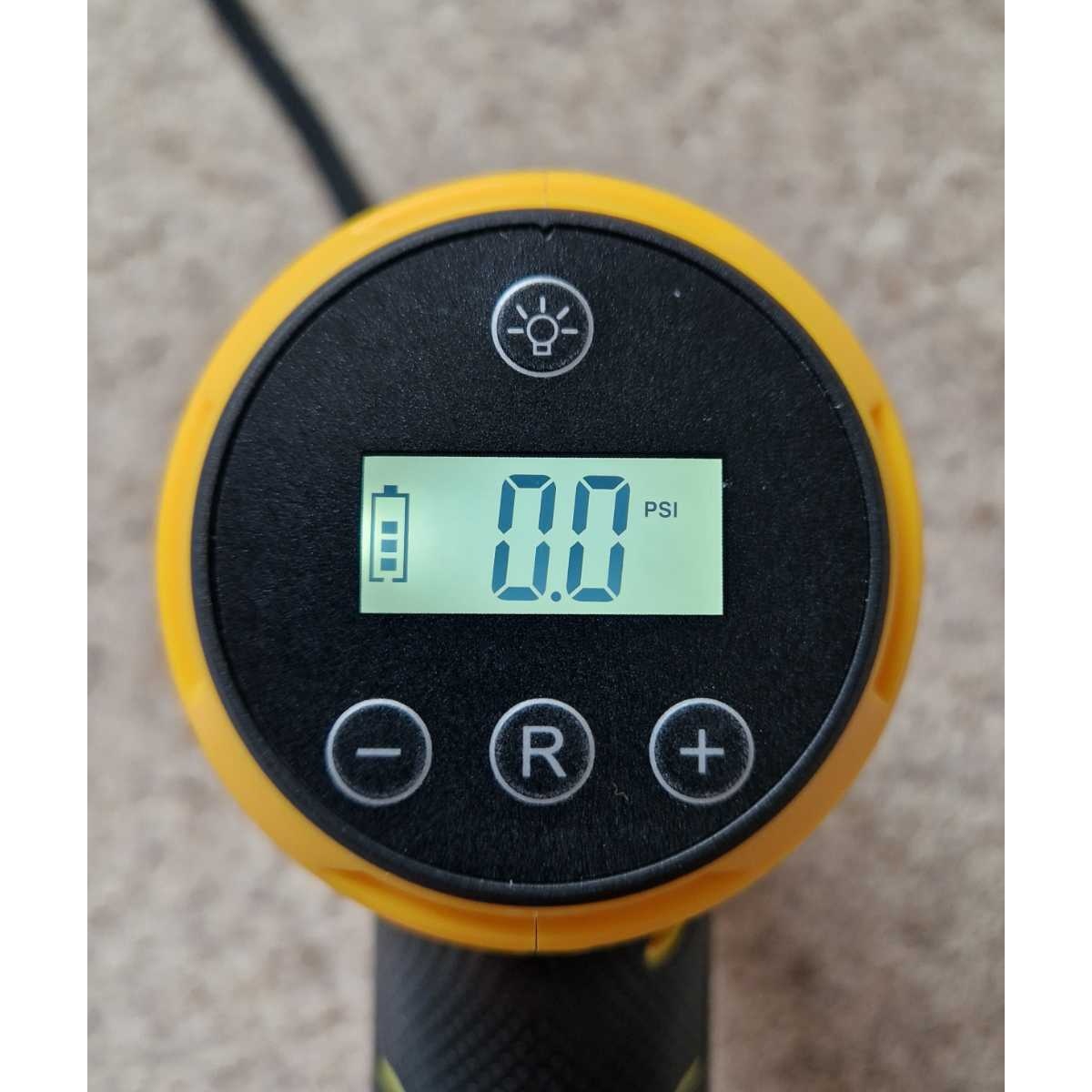 Rechargeable inflator with torch and preset pressure function for tyres, footballs, air beds, balloons, etc. Charges from any phone charger. USB-C charging cable included.
